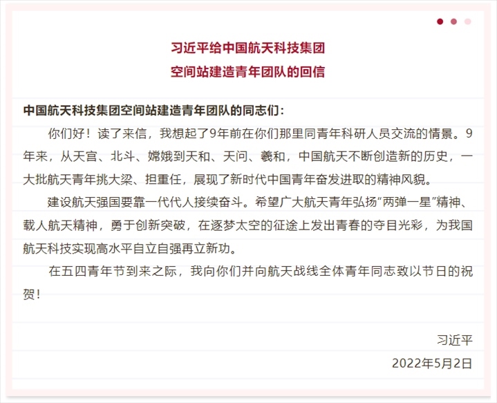 衛(wèi)星發(fā)射前,科普小衛(wèi)星研制團(tuán)隊(duì)的學(xué)生們給習(xí)近平總書記寫信,報(bào)告了小衛(wèi)星即將發(fā)射的消息。總書記在回信中希望孩子們“保持對(duì)知識(shí)的渴望,保持對(duì)探索的興趣,培育科學(xué)精神,刻苦學(xué)習(xí),努力實(shí)踐”。