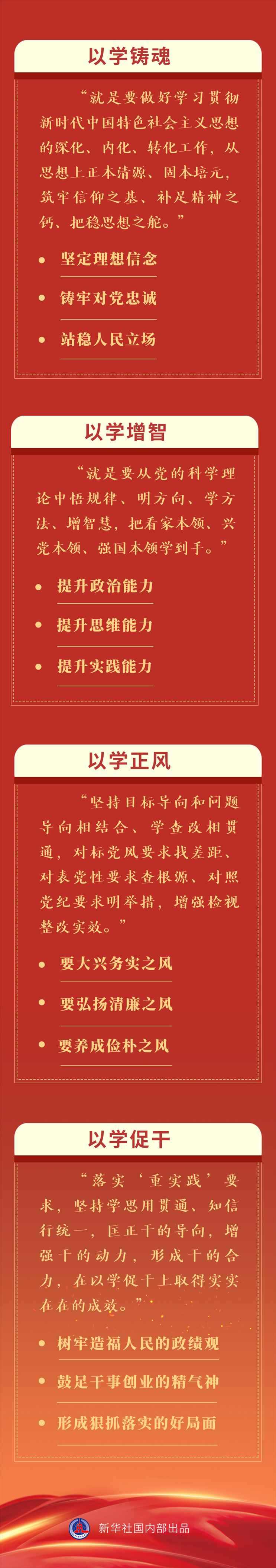 4月,在廣東,強調“以學鑄魂”,“就是要做好學習貫徹新時代中國特色社會主義思想的深化、內化、轉化工作,從思想上正本清源、固本培元,筑牢信仰之基、補足精神之鈣、把穩(wěn)思想之舵”,“堅定理想信念”“鑄牢對黨忠誠”“站穩(wěn)人民立場”。