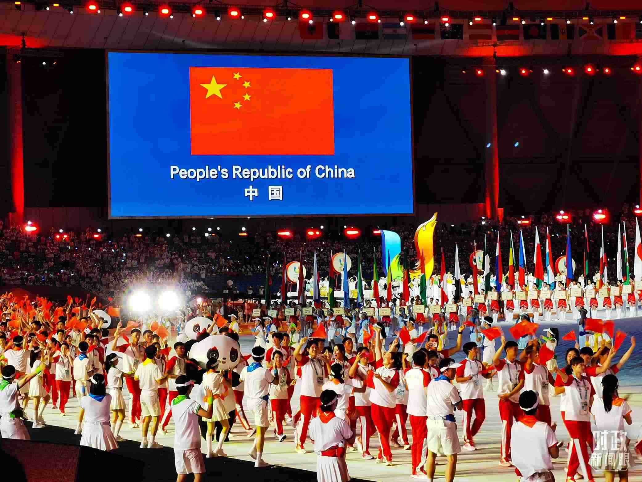 △中國大學(xué)生體育代表團(tuán)在開幕式上入場。(總臺央視記者張淳拍攝)