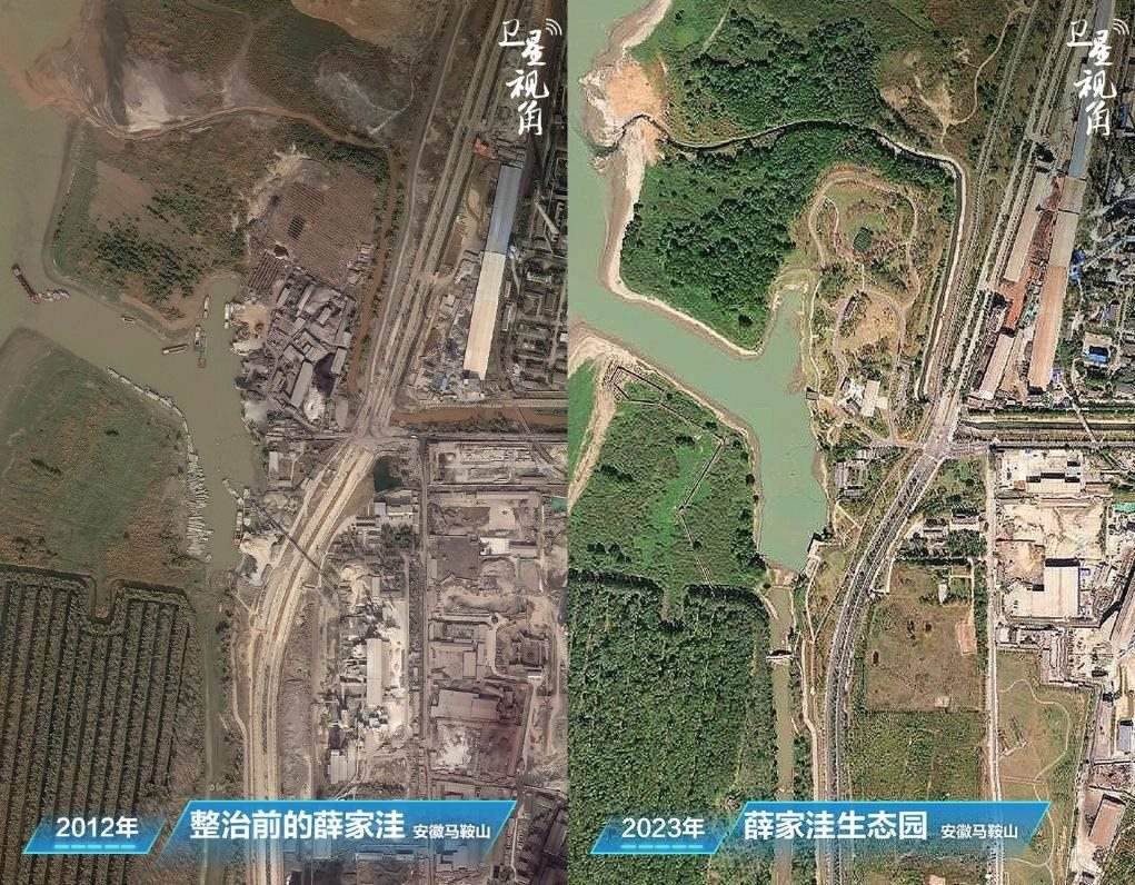 ↑2023年與2012年相比,經(jīng)過(guò)整治后的安徽馬鞍山薛家洼生態(tài)園綠意盎然。