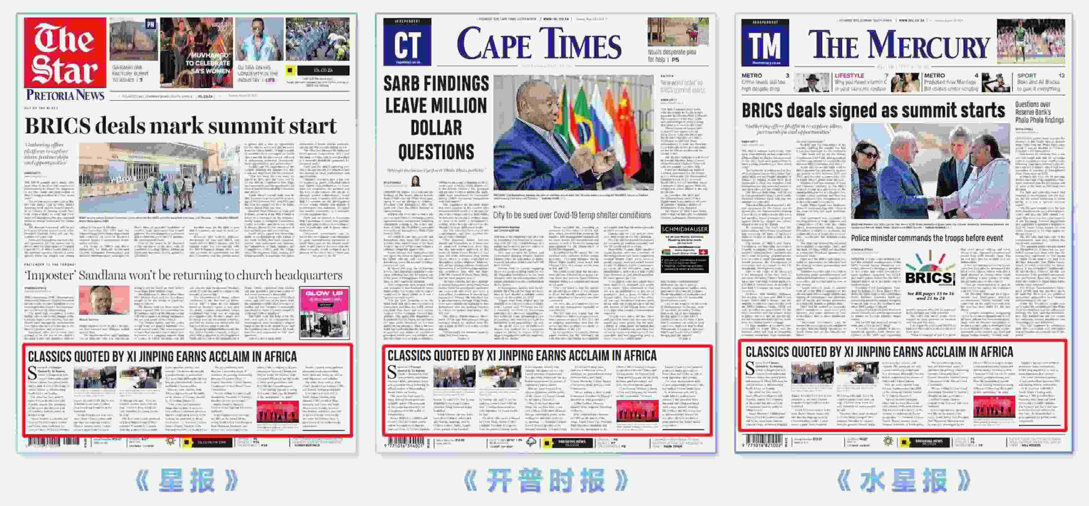 8月22日出版的南非三大主流報(bào)刊南非《星報(bào)》、《開普時(shí)報(bào)》、《水星報(bào)》,連續(xù)第二天在頭版顯著位置發(fā)表文章。文章指出,《平“語”近人——習(xí)近平喜歡的典故》第二季周日(8月20日)在南非約翰內(nèi)斯堡正式發(fā)布后,在非洲贏得了廣泛好評(píng)。系列節(jié)目已經(jīng)在多家非洲廣播公司播出,并在公共場所大屏幕展示,這些語錄吸引了大量非洲受眾觀看并獲得積極反響。