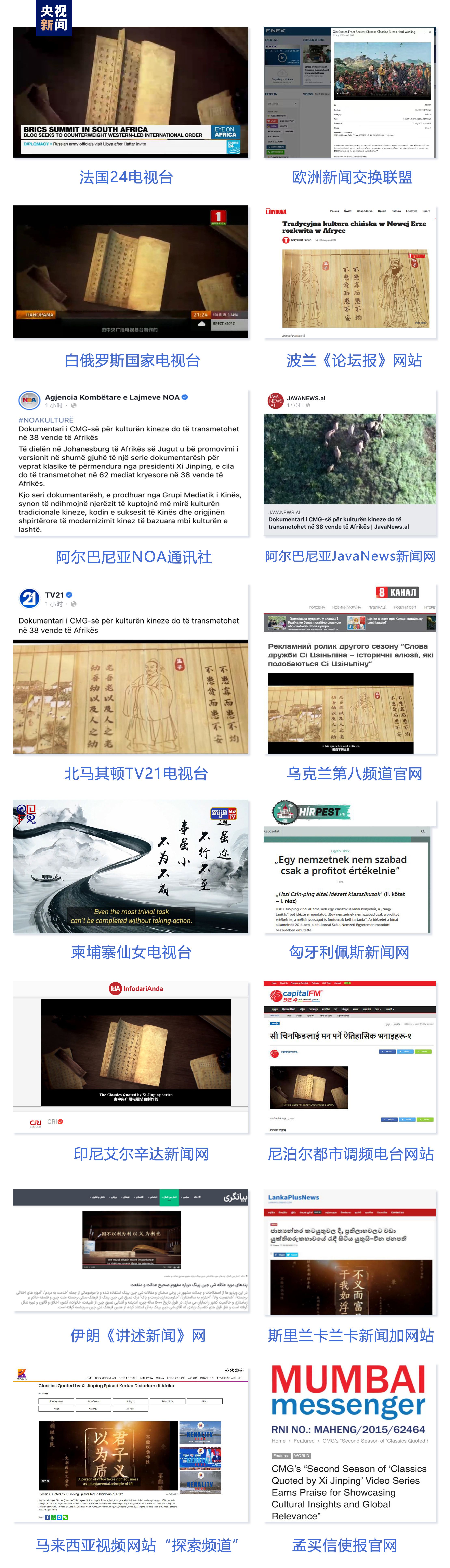 法國24電視臺(tái)、歐洲新聞交換聯(lián)盟、白俄羅斯國家電視臺(tái)、波蘭《論壇報(bào)》網(wǎng)站、阿爾巴尼亞NOA通訊社、北馬其頓TV21電視臺(tái)、烏克蘭第八頻道官網(wǎng)、匈牙利佩斯新聞網(wǎng)、柬埔寨東盟頭條新聞社、緬甸仰光傳媒、印尼艾爾辛達(dá)新聞網(wǎng)、尼泊爾都市調(diào)頻電臺(tái)網(wǎng)站等102家海外主流媒體紛紛轉(zhuǎn)播轉(zhuǎn)載《平“語”近人——習(xí)近平喜歡的典故》第二季多語種版本。