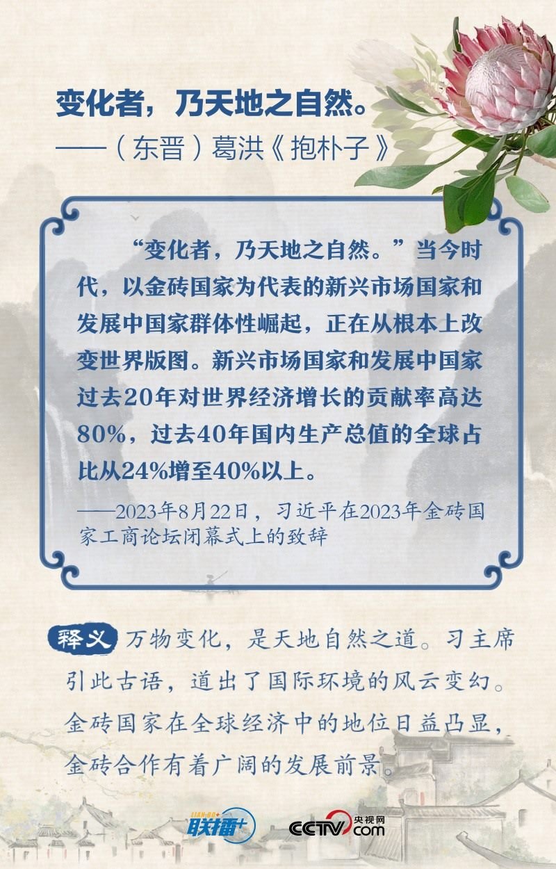 “順理而舉易為力,背時而動難為功”“變化者,乃天地之自然”“利莫大于治,害莫大于亂”…… 2023年的“金磚時間”里,習(xí)近平主席多次在講話中引經(jīng)據(jù)典,闡述金磚國家的合作與發(fā)展之道。央視網(wǎng)《聯(lián)播+》特?cái)X取習(xí)主席用典金句,與您一起學(xué)習(xí)。