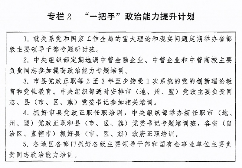 (二)突出“關(guān)鍵少數(shù)”政治訓(xùn)練。堅(jiān)持把政治訓(xùn)練貫穿干部成長(zhǎng)全周期,使干部的政治素養(yǎng)、政治能力與擔(dān)負(fù)的領(lǐng)導(dǎo)職責(zé)相匹配。強(qiáng)化“一把手”政治培訓(xùn),有計(jì)劃地選調(diào)地方、部門、國(guó)有企事業(yè)單位主要負(fù)責(zé)同志到黨校(行政學(xué)院)、干部學(xué)院參加專題培訓(xùn)。實(shí)施“一把手”政治能力提升計(jì)劃(專欄2)。省(自治區(qū)、直轄市)、市(地、州、盟)、縣(市、區(qū)、旗)黨政領(lǐng)導(dǎo)班子成員每2至3年到黨校(行政學(xué)院)、干部學(xué)院至少接受1次系統(tǒng)的黨的創(chuàng)新理論教育和黨性教育,5年內(nèi)累計(jì)不少于2個(gè)月。圍繞提高政治能力和領(lǐng)導(dǎo)能力,加強(qiáng)機(jī)關(guān)司局長(zhǎng)、處長(zhǎng)任職培訓(xùn)。重視對(duì)女干部、少數(shù)民族干部、黨外干部等的政治培訓(xùn)。加強(qiáng)對(duì)高層次人才的政治引領(lǐng),中央組織部會(huì)同有關(guān)單位每年組織一定數(shù)量人才開(kāi)展國(guó)情研修。