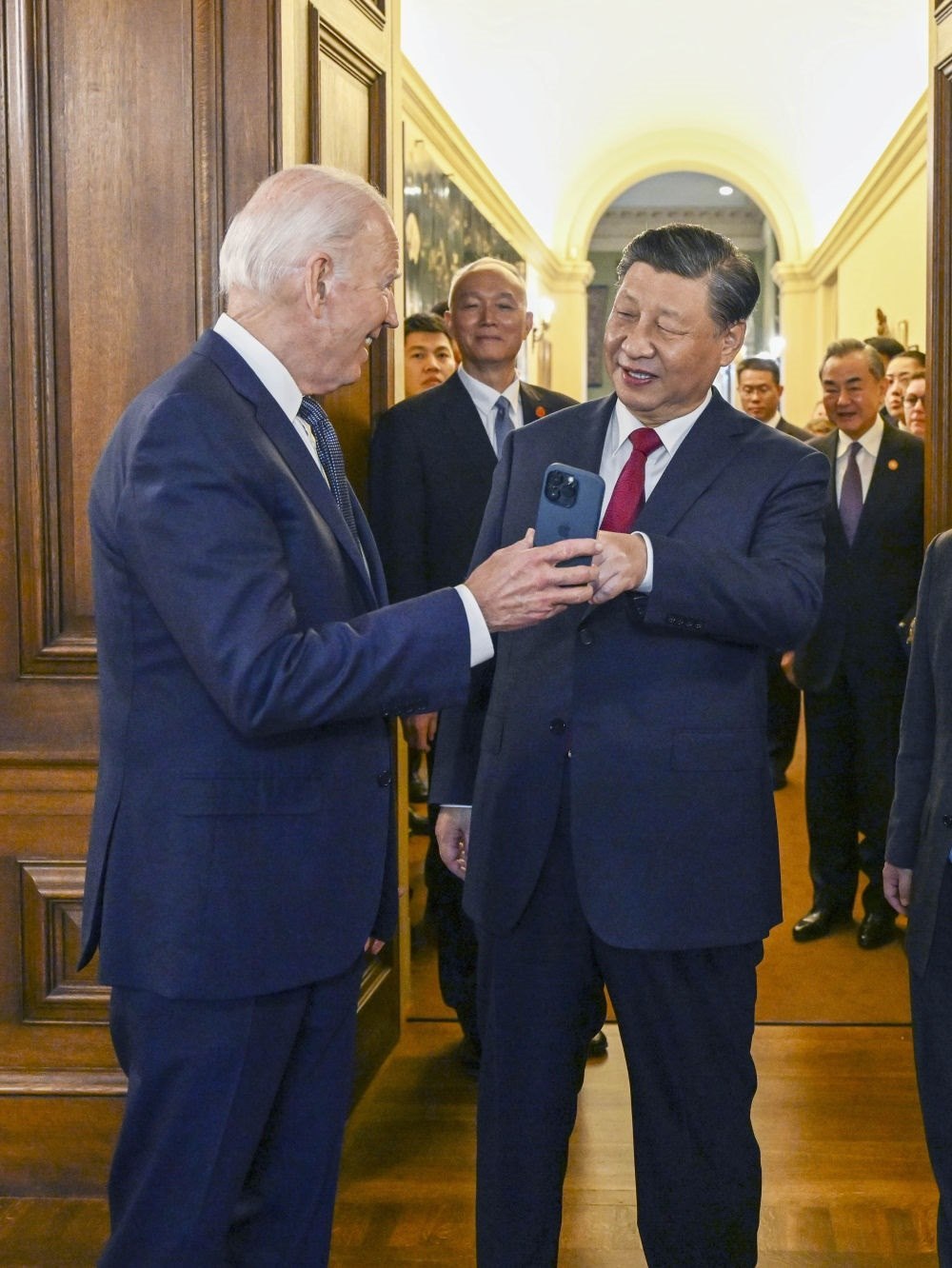 當(dāng)?shù)貢r(shí)間11月15日中午,美國(guó)舊金山郊外的斐洛里莊園,習(xí)近平主席結(jié)束同美國(guó)總統(tǒng)拜登的晤談,出席拜登總統(tǒng)舉行的宴會(huì)。拜登在手機(jī)上展示了1985年習(xí)近平在擔(dān)任正定縣委書記時(shí)訪問(wèn)舊金山的一張照片。這是展示的照片。新華社發(fā)