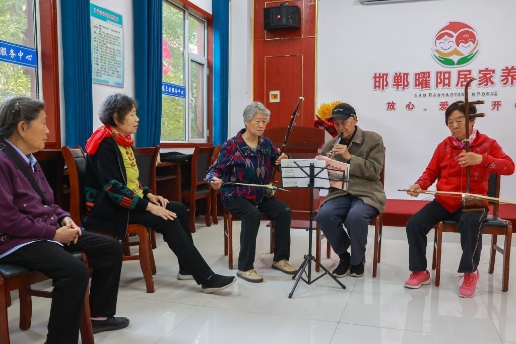 圖為河北省邯鄲市邯山區(qū)曜陽(yáng)養(yǎng)老服務(wù)中心內(nèi),老人在學(xué)習(xí)樂(lè)器演奏。新華社記者趙鴻宇 攝