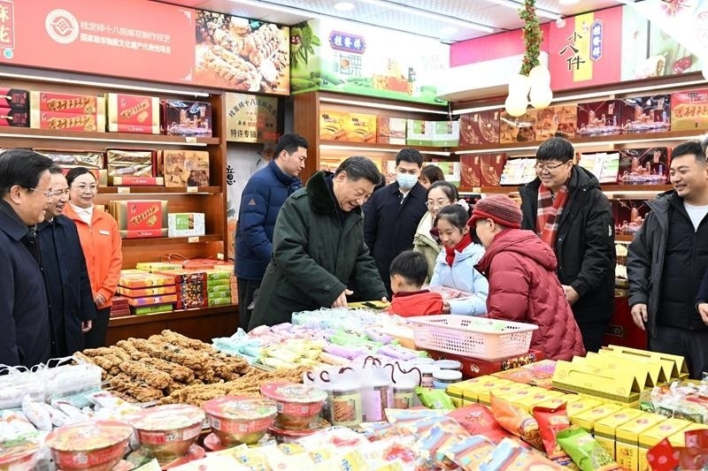 △2月1日下午,習(xí)近平總書(shū)記在天津古文化街考察時(shí),走進(jìn)店鋪同現(xiàn)場(chǎng)群眾互動(dòng)交流。