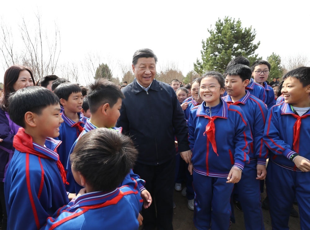 2019年4月8日,習(xí)近平等黨和國(guó)家領(lǐng)導(dǎo)人來到北京市通州區(qū)永順鎮(zhèn)參加首都義務(wù)植樹活動(dòng)。這是習(xí)近平同少先隊(duì)員在一起。
