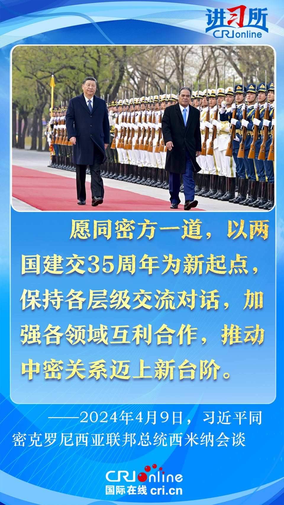 4月9日下午,中國(guó)國(guó)家主席習(xí)近平在北京同密克羅尼西亞聯(lián)邦總統(tǒng)西米納舉行會(huì)談,此訪是西米納總統(tǒng)就任以來(lái)首次訪華,兩國(guó)領(lǐng)導(dǎo)人就雙邊關(guān)系發(fā)展及共同關(guān)心的問(wèn)題深入交換意見(jiàn)。