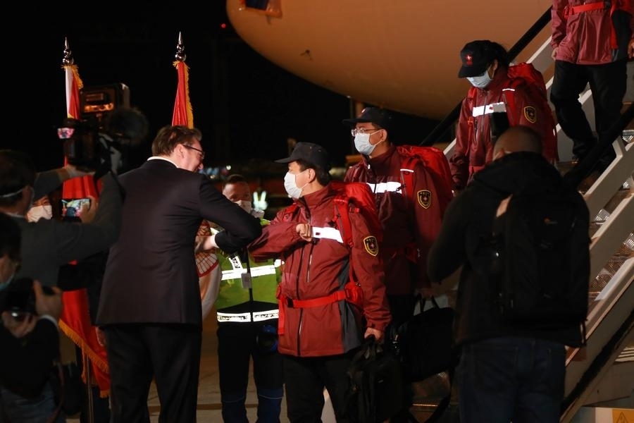 中國醫(yī)療團(tuán)隊在貝爾格萊德尼古拉·特斯拉機場降落時已是深夜。武契奇率領(lǐng)塞方多名高級官員到機場迎接。疫情期間不建議握手,于是這位塞爾維亞領(lǐng)導(dǎo)人選擇和中國專家團(tuán)成員一一碰肘以示尊重。對中國的及時支援心懷感激,他還在機場親吻了一面五星紅旗。