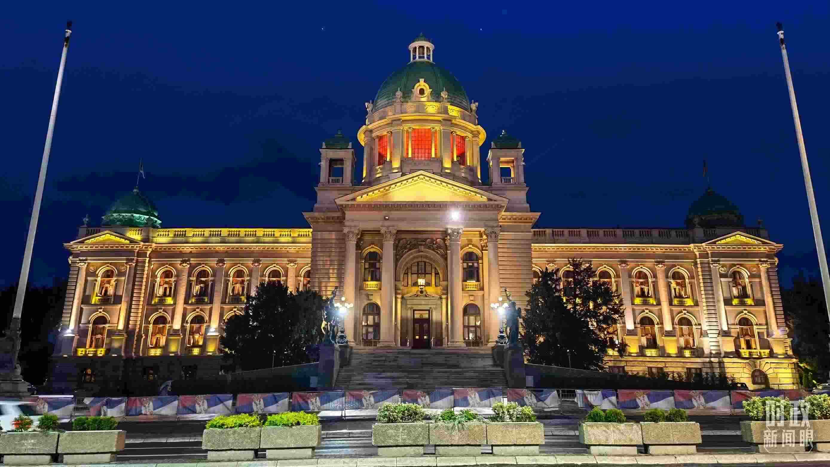 △塞爾維亞國會大廈亮起紅燈,歡迎習主席到訪。(總臺央視記者石丞拍攝)