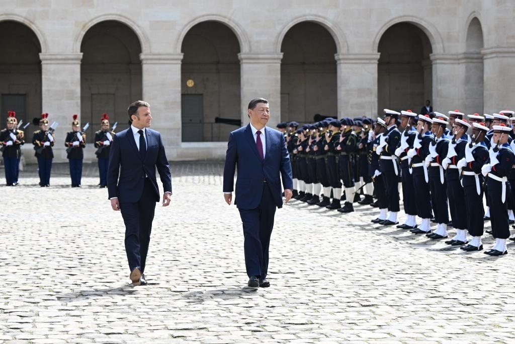 當天下午,習(xí)近平在巴黎出席馬克龍舉行的隆重盛大歡迎儀式。兩國元首檢閱法蘭西共和國衛(wèi)隊和陸??杖妰x仗隊,并觀看分列式。