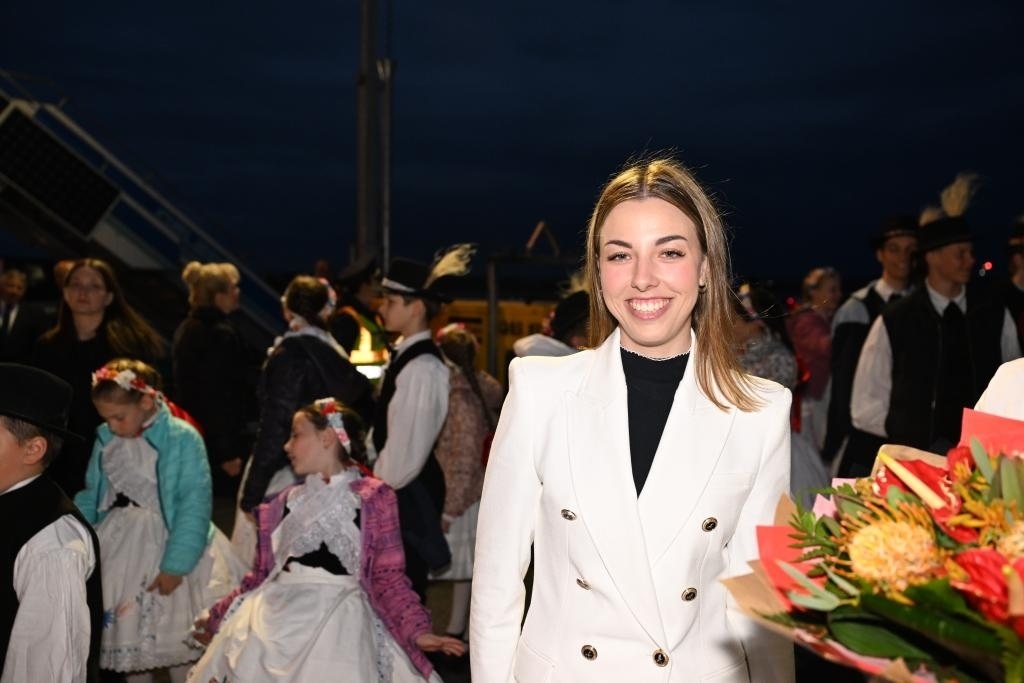 當(dāng)?shù)貢r間5月8日晚,在匈牙利布達(dá)佩斯國際機(jī)場歡迎隊(duì)伍中的匈牙利姑娘歐拉·塔瑪拉。新華社記者謝環(huán)馳攝