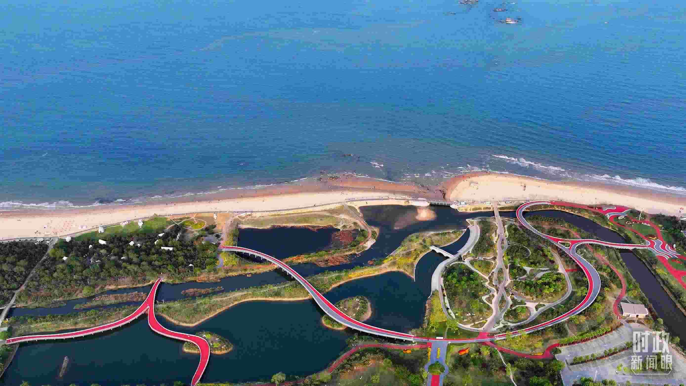 這是一條功能復(fù)合、活力多元的陽光海岸帶,串聯(lián)起沿海岸線的萬平口景區(qū)、海洋公園、海洋美學(xué)館、桃花島景區(qū)等13個景區(qū),以及王家皂、張家臺等8個沿海民俗村,還建設(shè)有觀景平臺、運動步道、游客休憩廣場等。