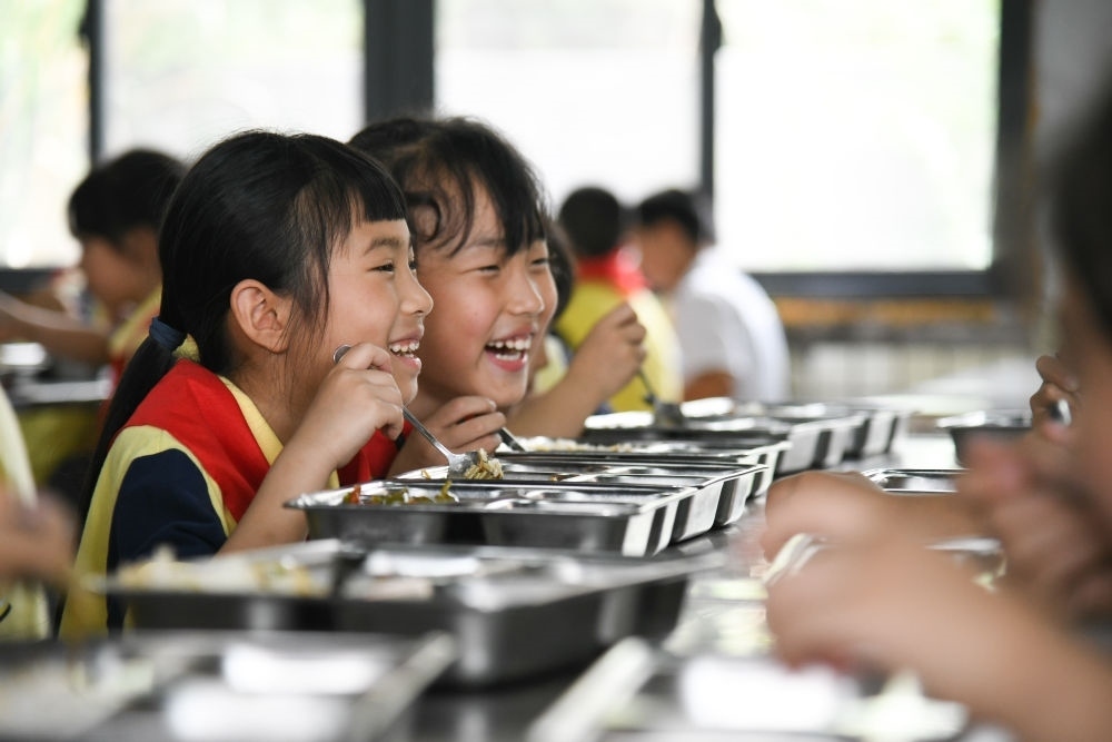 5月31日,學(xué)生在午餐時聊天。