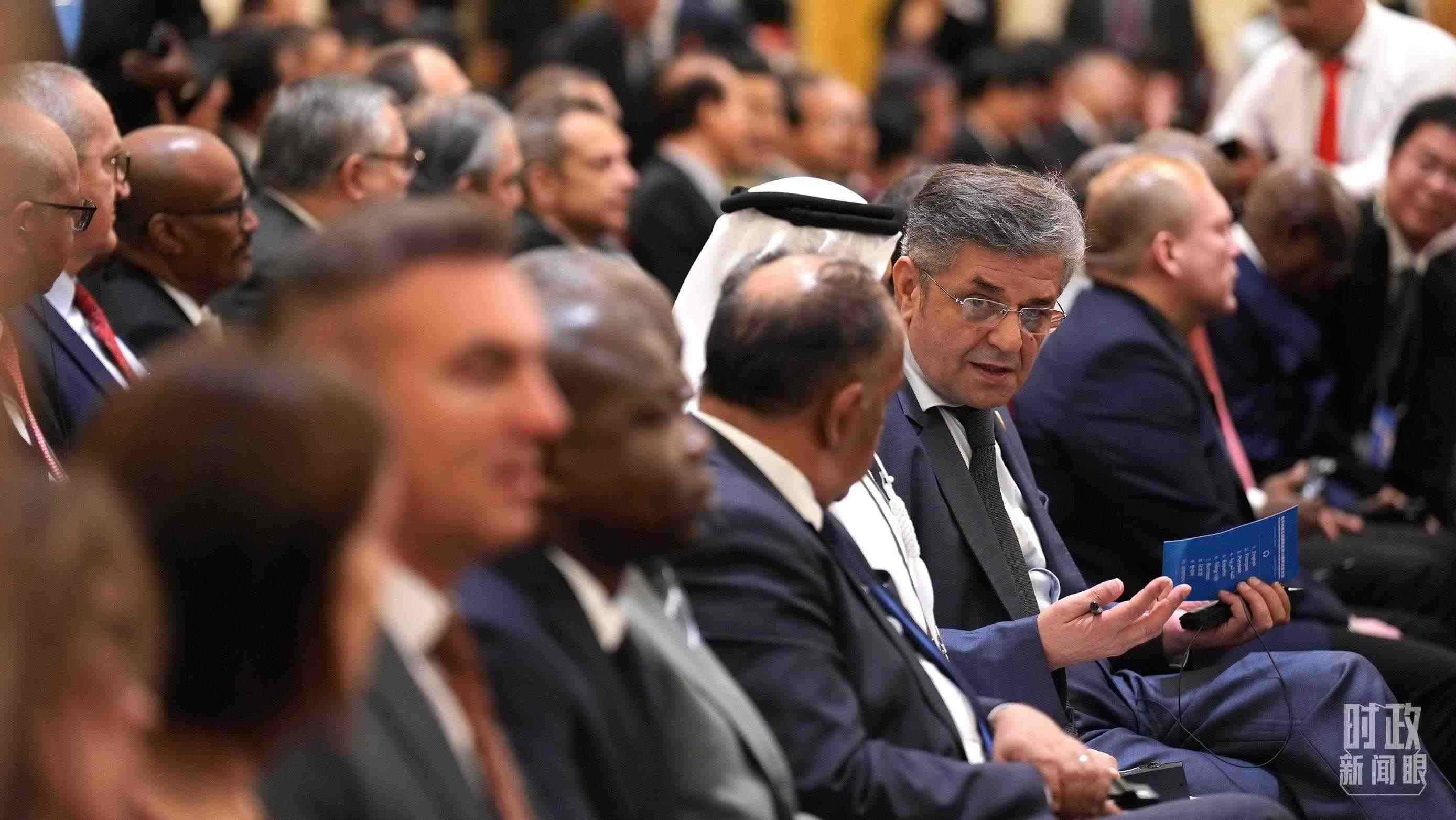 △2023年10月,第三屆“一帶一路”國(guó)際合作高峰論壇參會(huì)人員駐足了解“一帶一路”標(biāo)志性項(xiàng)目。(總臺(tái)國(guó)廣記者李晉拍攝)