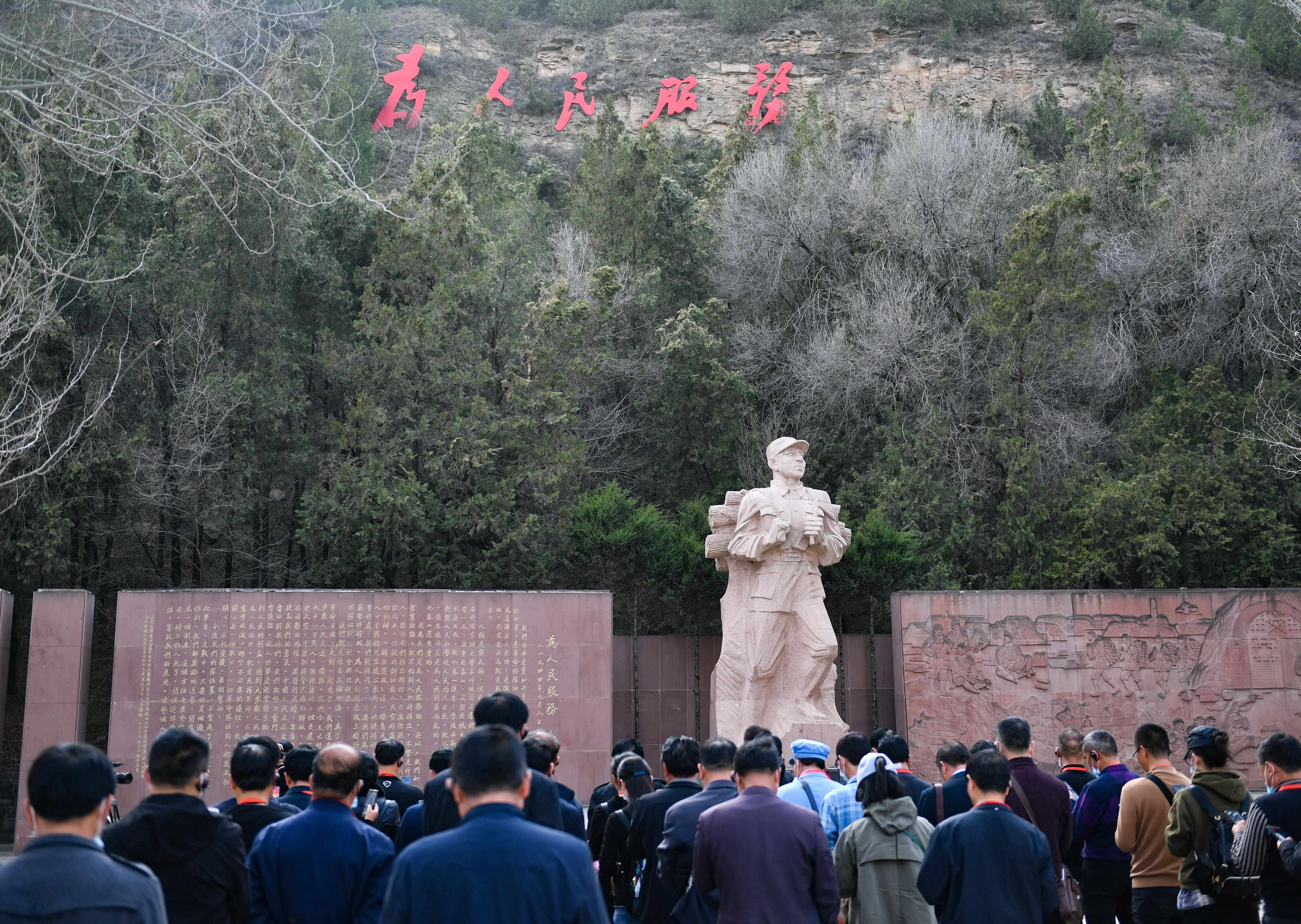 延安棗園,《為人民服務(wù)》講話紀(jì)念廣場(chǎng),張思德負(fù)薪前行的雕像,巍然屹立,“為人民服務(wù)”5個(gè)鮮紅大字,熠熠生輝?!熬哂腥娜鉃橹袊?guó)人民服務(wù)的精神”,在黨的七大上被寫(xiě)進(jìn)黨章。