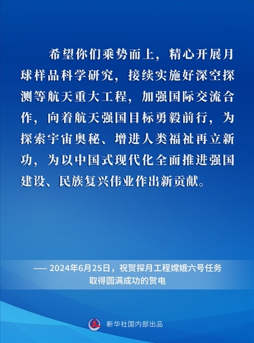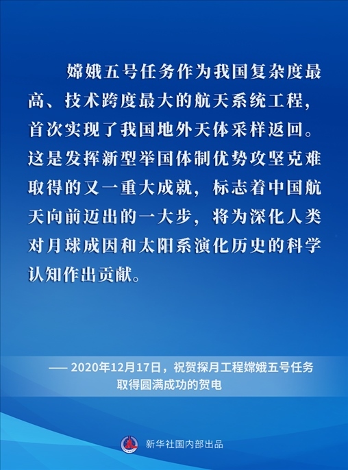 黨的十八大以來,在以習(xí)近平同志為核心的黨中央關(guān)心引領(lǐng)下,中國(guó)探月工程取得舉世矚目的重大成就,為探索宇宙奧秘、增進(jìn)人類福祉屢立新功,為以中國(guó)式現(xiàn)代化全面推進(jìn)強(qiáng)國(guó)建設(shè)、民族復(fù)興偉業(yè)作出卓越貢獻(xiàn)。