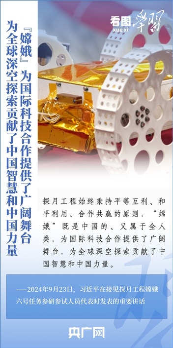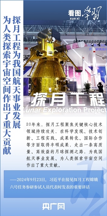 中國探月工程成果凝結(jié)著我國幾代航天人的智慧和心血。9月23日,習(xí)近平總書記接見探月工程嫦娥六號任務(wù)參研參試人員代表并發(fā)表重要講話。總書記高度肯定嫦娥六號任務(wù)成功的重要意義,以及探月工程為我國航天事業(yè)發(fā)展、為人類探索宇宙空間作出的重大貢獻(xiàn),勉勵航天戰(zhàn)線工作者再接再厲、乘勢而上,為建設(shè)航天強(qiáng)國再立新功。一起來學(xué)習(xí)!