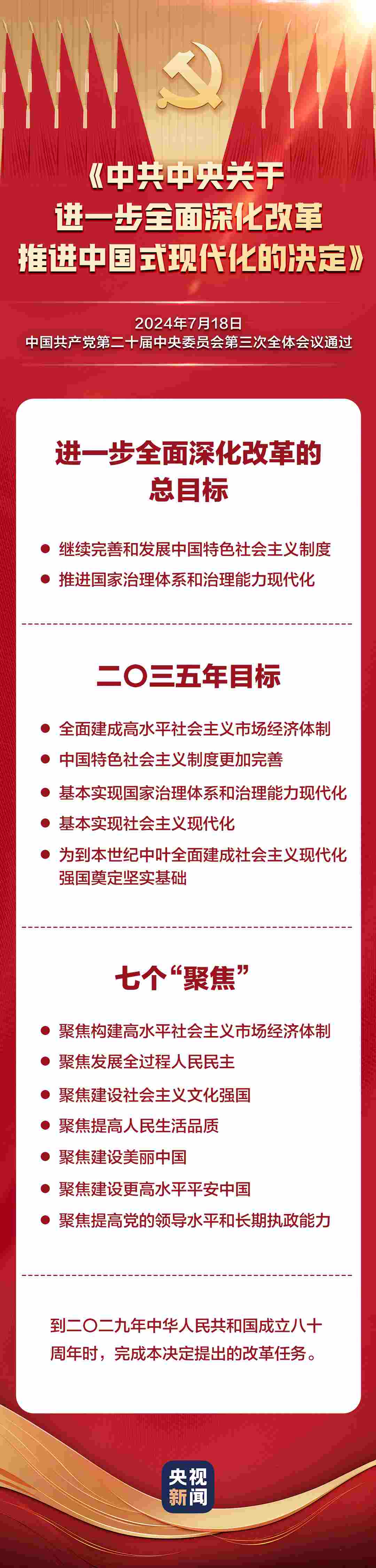 中國共產(chǎn)黨第二十屆中央委員會第三次全體會議,于2024年7月15日至18日在北京舉行。全會最重要的成果是審議通過《中共中央關(guān)于進(jìn)一步全面深化改革、推進(jìn)中國式現(xiàn)代化的決定》。《決定》共15部分、60條,分三大板塊,一文速覽:
