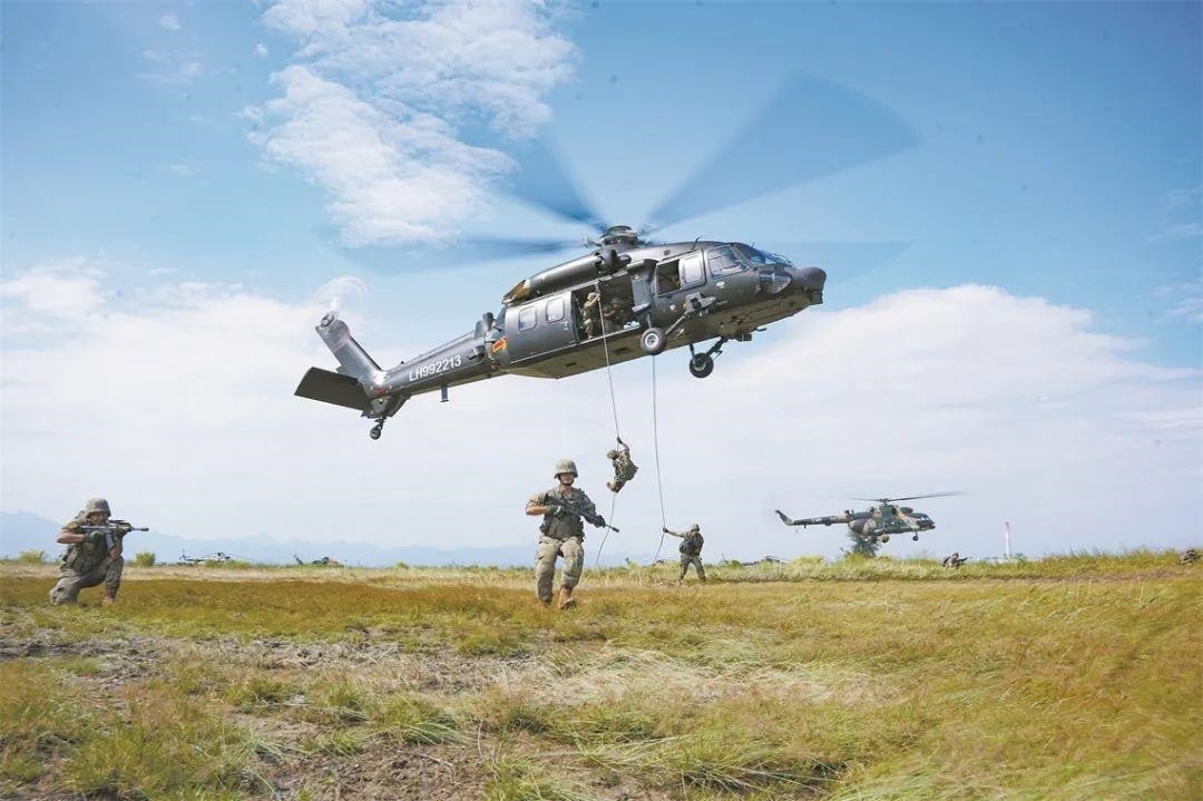 △第72集團(tuán)軍某旅某合成營(yíng)官兵在陸航部隊(duì)配合下開(kāi)展機(jī)降訓(xùn)練。