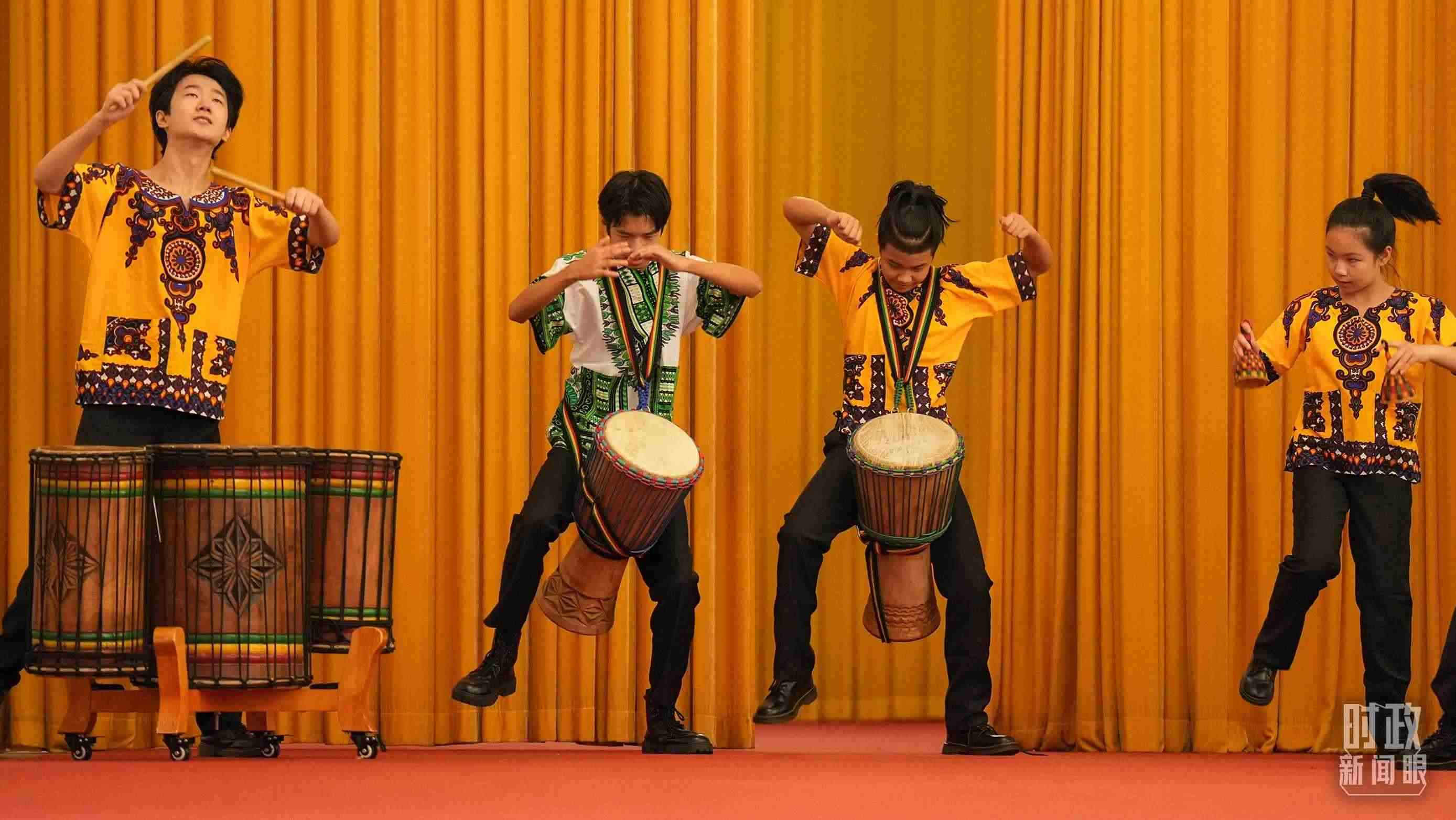 在前往宴會(huì)廳沿途,身著中國(guó)民族服裝和非洲特色服裝的青少年,打起歡快的非洲鼓,載歌載舞歡迎遠(yuǎn)道而來(lái)的貴賓。