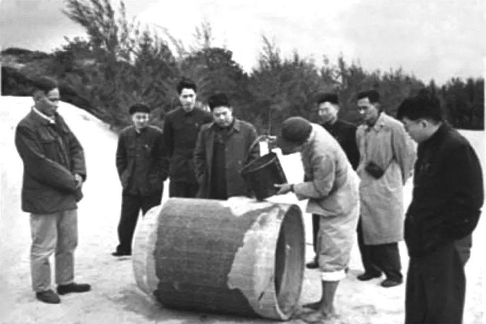 △ 谷文昌在湖尾地下水工地與工程技術(shù)人員一起試驗濾水管。