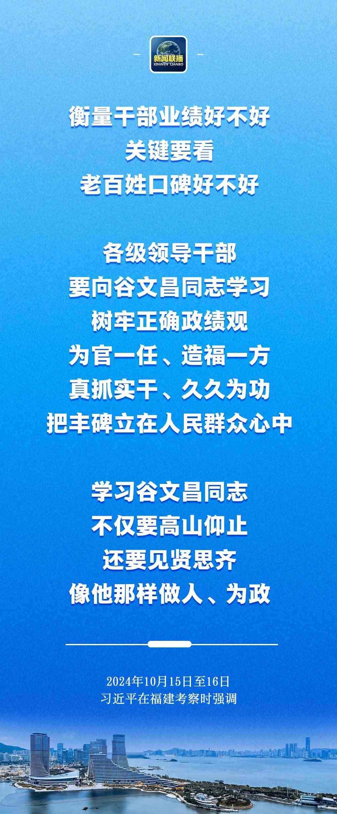 習(xí)近平在谷文昌紀(jì)念館考察時指出,衡量干部業(yè)績好不好,關(guān)鍵要看老百姓口碑好不好。各級領(lǐng)導(dǎo)干部要向谷文昌同志學(xué)習(xí),樹牢正確政績觀,為官一任、造福一方,真抓實干、久久為功,把豐碑立在人民群眾心中。學(xué)習(xí)谷文昌同志,不僅要高山仰止,還要見賢思齊,像他那樣做人、為政。