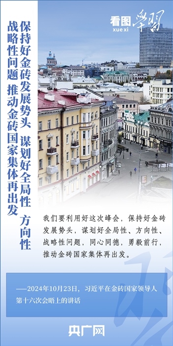 當(dāng)?shù)貢r(shí)間10月23日,國家主席習(xí)近平在俄羅斯喀山出席金磚國家領(lǐng)導(dǎo)人第十六次會晤并發(fā)表重要講話。習(xí)主席深刻闡述推動“大金磚合作”高質(zhì)量發(fā)展的中國主張,就金磚大家庭發(fā)展合作提出五點(diǎn)務(wù)實(shí)舉措,表達(dá)了中方愿同金磚各國一道,攜手更多“全球南方”國家共同推動構(gòu)建人類命運(yùn)共同體的真誠愿望。一起來學(xué)習(xí)!