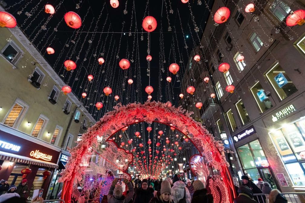 這是2024年2月9日在俄羅斯首都莫斯科拍攝的掛滿中國新年主題裝飾的街道。新華社記者 白雪騏 攝