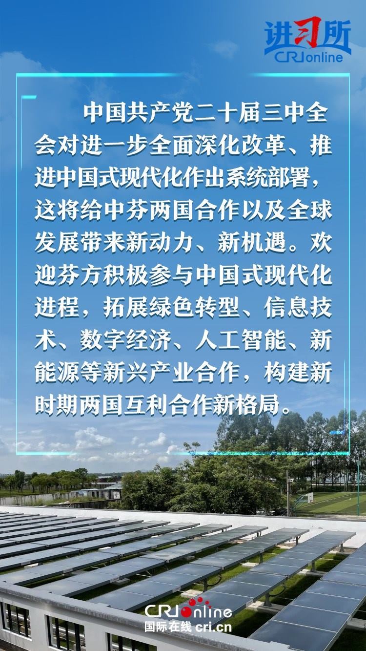 習(xí)近平指出,建交以來,中芬始終友好相處、互尊互信,樹立了國與國之間超越歷史、文化、制度差異,平等交往的典范。中方愿同芬方一道,加強(qiáng)戰(zhàn)略合作,弘揚(yáng)友好傳統(tǒng),將中芬面向未來的新型合作伙伴關(guān)系進(jìn)一步推向前進(jìn),更好造福兩國和兩國人民,為世界和平和發(fā)展作出新貢獻(xiàn)。