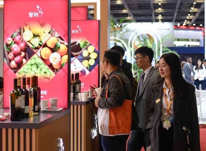 △2024年11月7日,觀眾在第七屆進(jìn)博會(huì)國家展上的智利館了解智利紅酒。