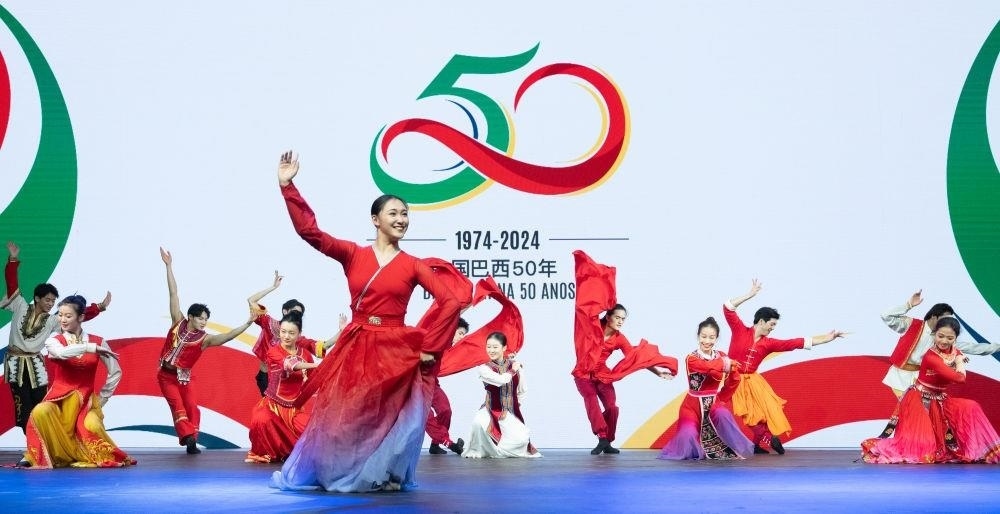 △當(dāng)?shù)貢r(shí)間2024年8月15日,在巴西首都巴西利亞,來自北京舞蹈學(xué)院民族舞團(tuán)的演員在慶祝中巴建交50周年招待會(huì)上表演。