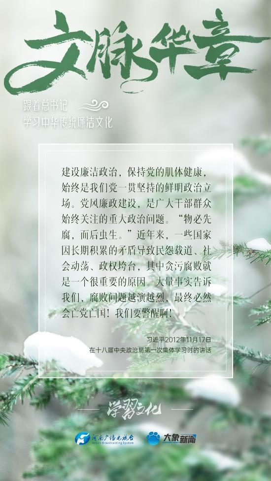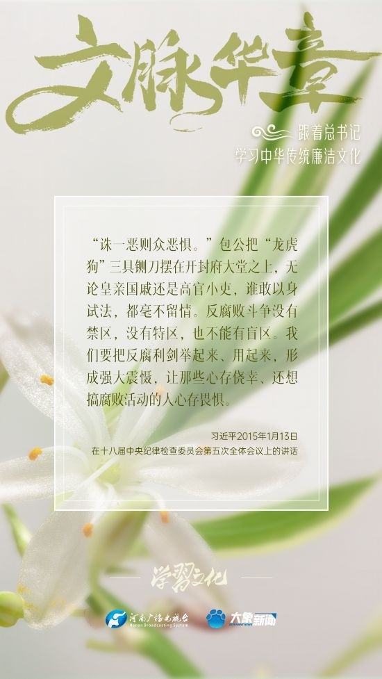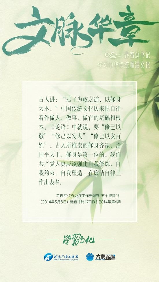 中華優(yōu)秀傳統(tǒng)文化蘊含著豐富的廉潔文化,習近平總書記曾指出:沒有中華優(yōu)秀傳統(tǒng)文化、革命文化、社會主義先進文化的底蘊和滋養(yǎng),信仰信念就難以深沉而執(zhí)著。總書記常常引經據典,教育引導廣大黨員干部正心修身,涵養(yǎng)文化,守住為政之本。大象新聞分五期為您梳理,我們一起跟著總書記學習中華傳統(tǒng)廉潔文化。今天推出第五期。