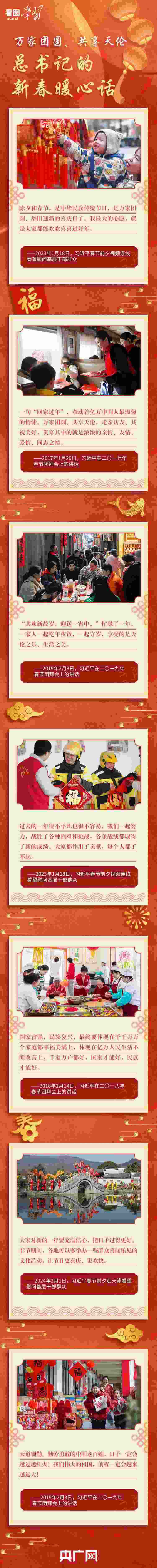 “共歡新故歲,迎送一宵中。”作為中華民族的傳統(tǒng)節(jié)日,除夕和春節(jié)是萬家團(tuán)圓、辭舊迎新最重要的日子。每年春節(jié)前夕,習(xí)近平總書記都要看望慰問各地基層干部群眾,向全國各族人民送上新春祝福。