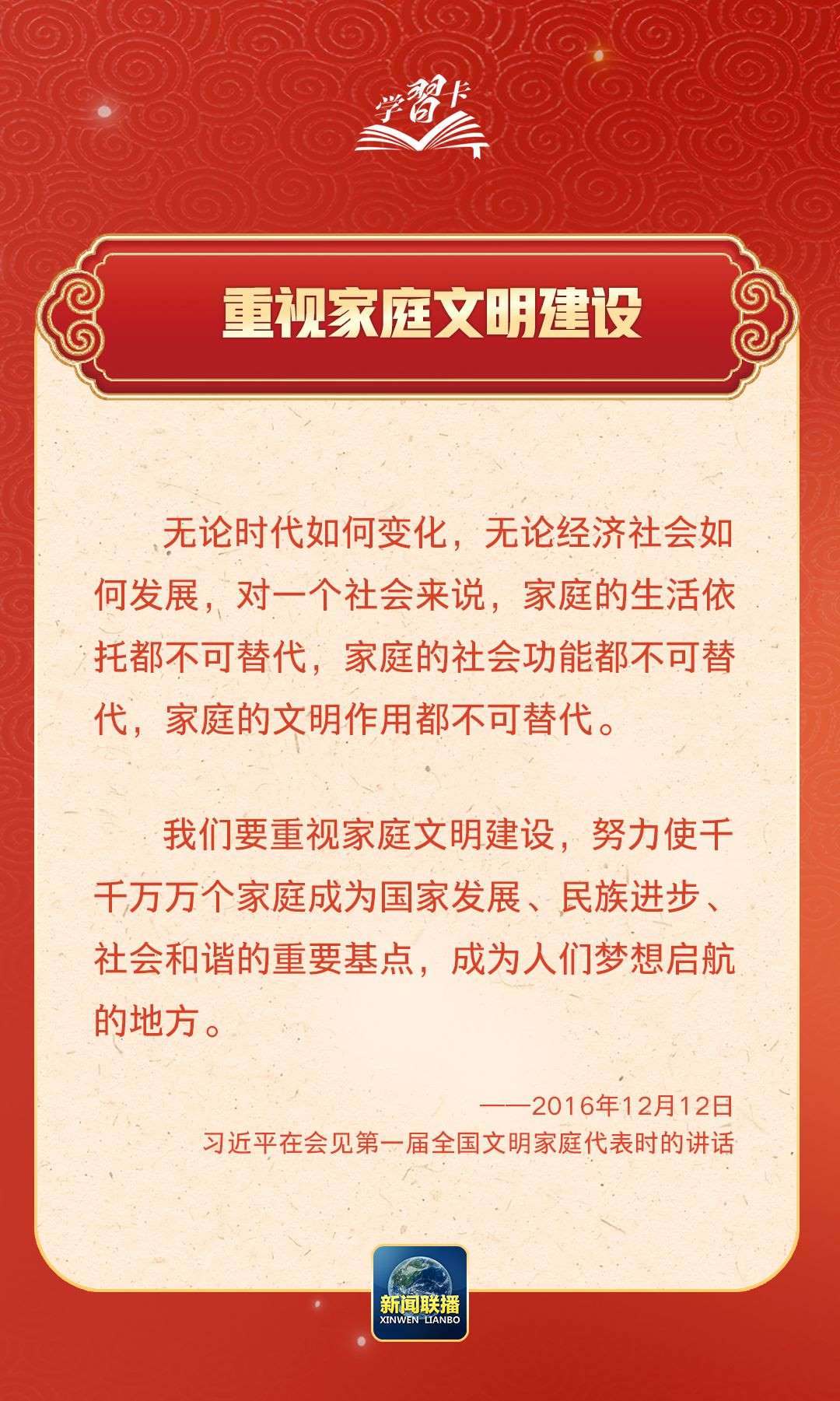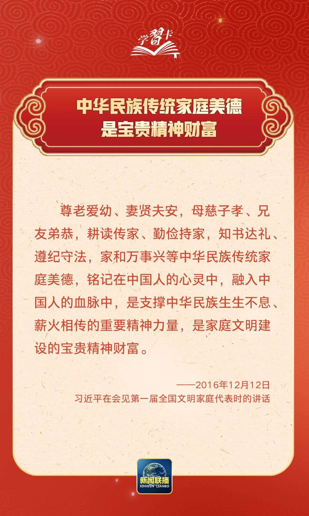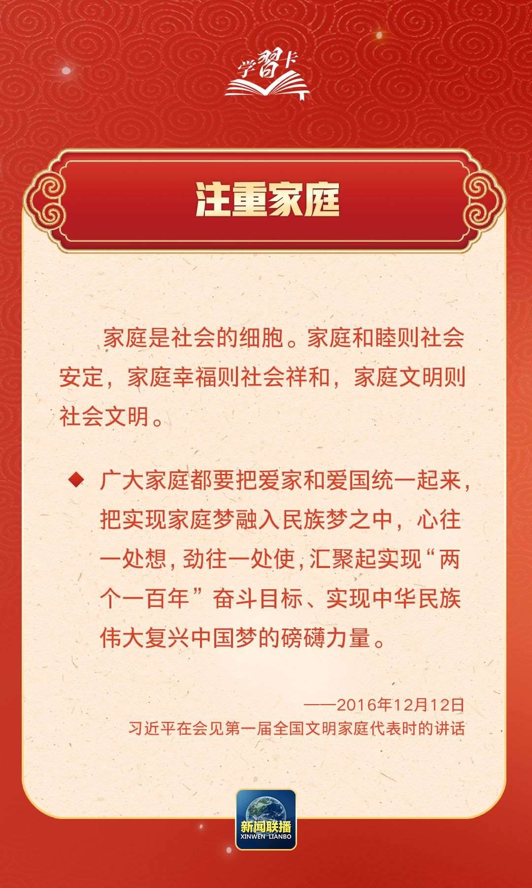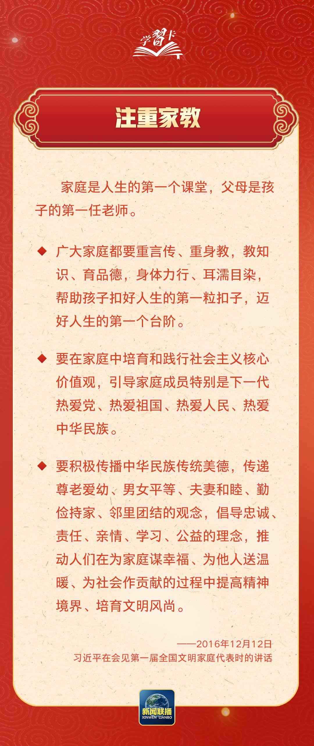 在習(xí)近平總書(shū)記心中,家國(guó)的分量很重。他多次強(qiáng)調(diào)要重視家庭建設(shè),提倡愛(ài)家愛(ài)國(guó)相統(tǒng)一,指出廣大家庭都要弘揚(yáng)優(yōu)良家風(fēng),以千千萬(wàn)萬(wàn)家庭的好家風(fēng)支撐起全社會(huì)的好風(fēng)氣。近日,《求是》雜志發(fā)表習(xí)近平總書(shū)記重要文章《注重家庭,注重家教,注重家風(fēng)》,一起學(xué)習(xí)↓