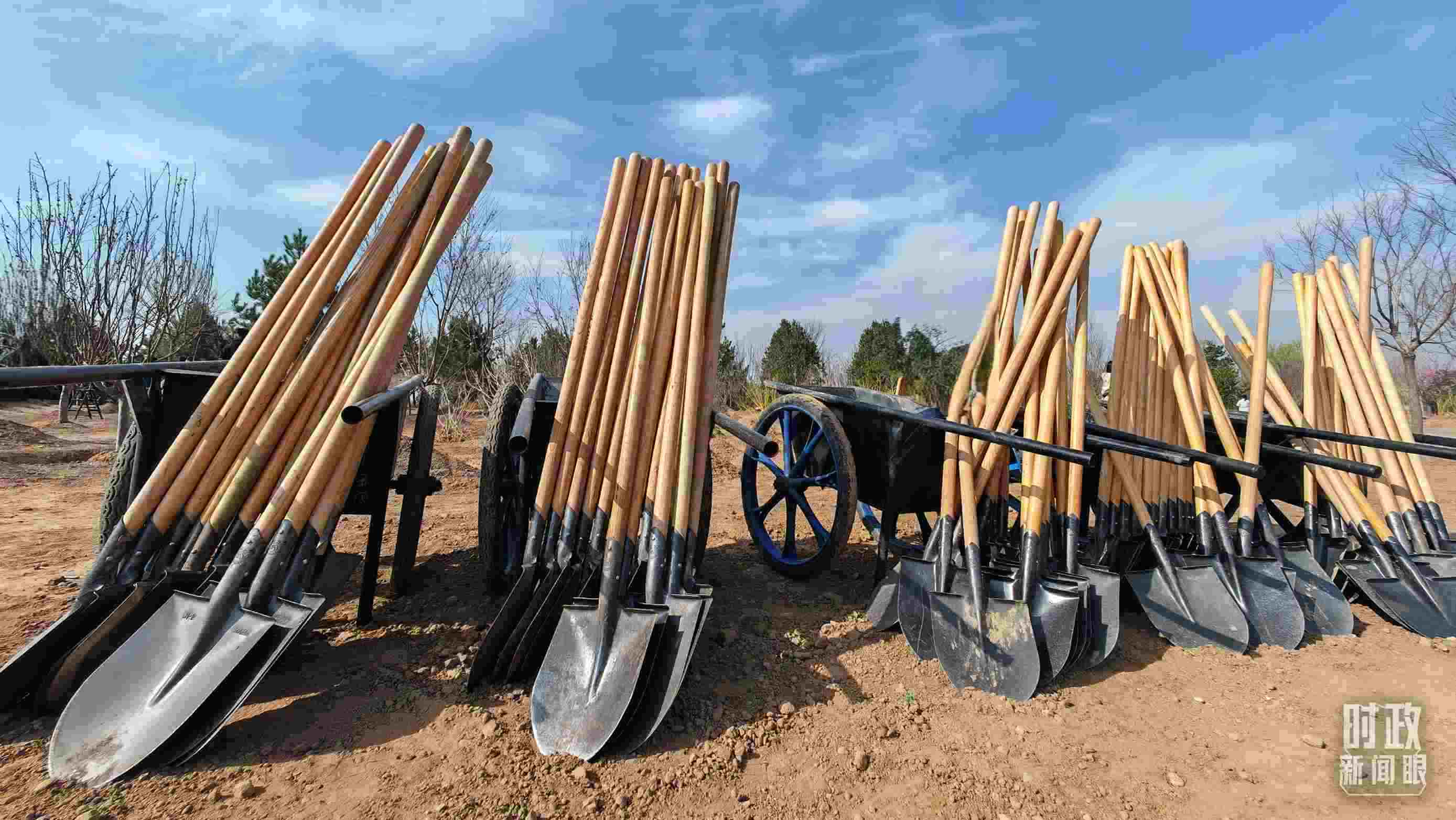 △植樹(shù)現(xiàn)場(chǎng)整齊擺放的工具。(總臺(tái)央視記者王策拍攝)