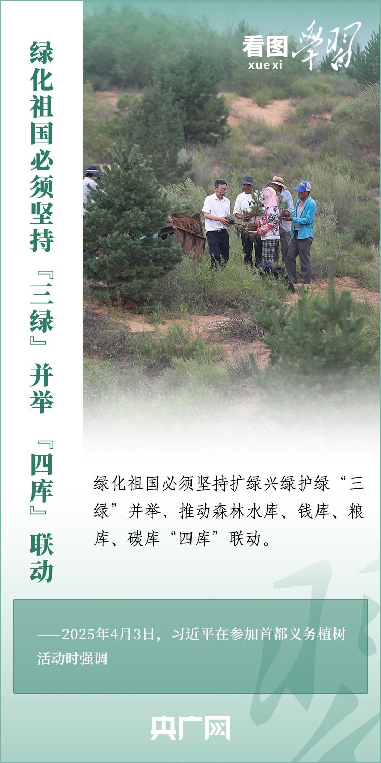 植樹造林是生態(tài)文明建設(shè)重要一環(huán)。4月3日,習(xí)近平總書記參加首都義務(wù)植樹活動(dòng)。在植樹現(xiàn)場(chǎng),總書記高度肯定國(guó)土綠化工作取得來之不易的成績(jī),強(qiáng)調(diào)綠化祖國(guó)必須堅(jiān)持“三綠”并舉、“四庫(kù)”聯(lián)動(dòng),要更加注重“提質(zhì)”“興業(yè)”“利民”,“匯聚共建美麗中國(guó)的磅礴力量,讓祖國(guó)大地更加綠意盎然、生機(jī)勃發(fā)”。一起來學(xué)習(xí)!