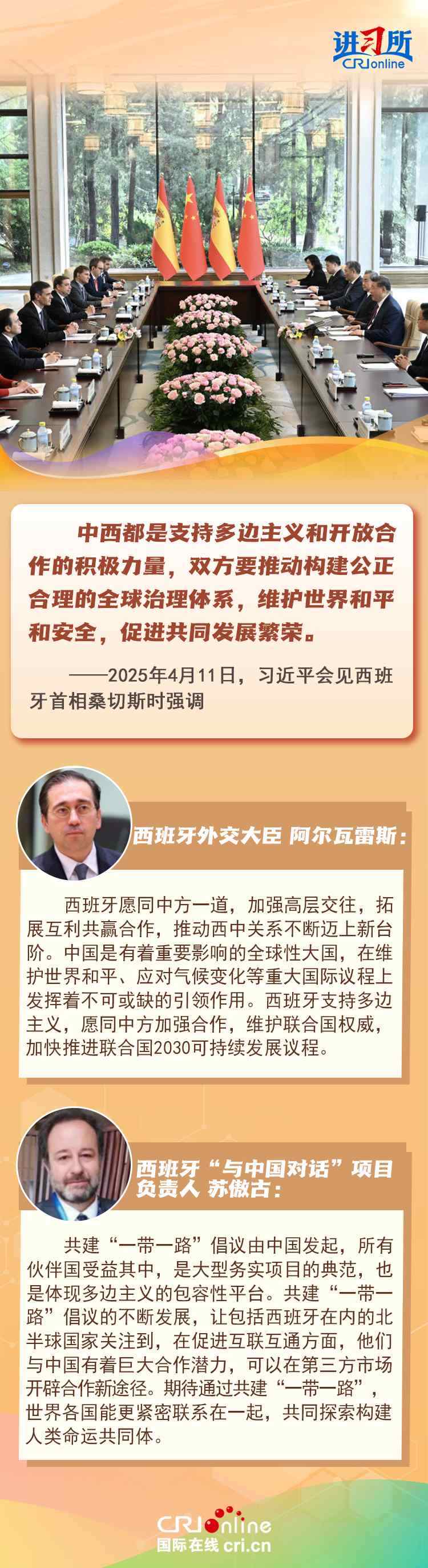 4月11日,中國國家主席習(xí)近平在北京會見來華訪問的西班牙首相桑切斯時表示,中西友好是兩國人民基于傳統(tǒng)友誼、現(xiàn)實需要、長遠利益作出的正確抉擇,中西都是支持多邊主義和開放合作的積極力量,雙方要推動構(gòu)建公正合理的全球治理體系,維護世界和平和安全,促進共同發(fā)展繁榮。
