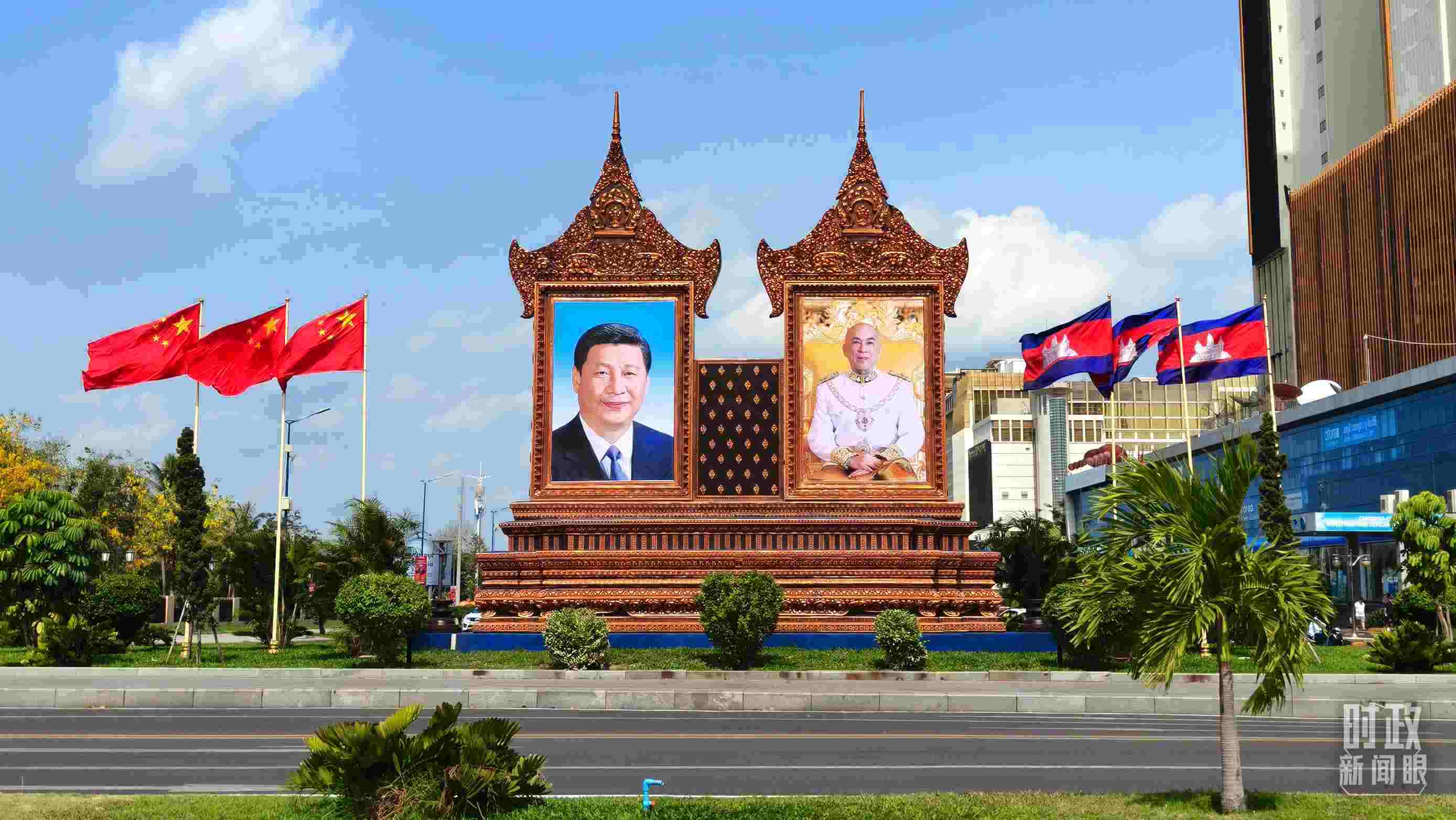 △金邊街頭的巨幅中柬兩國領(lǐng)導人照片和國旗。(總臺央視記者陸泓宇拍攝)