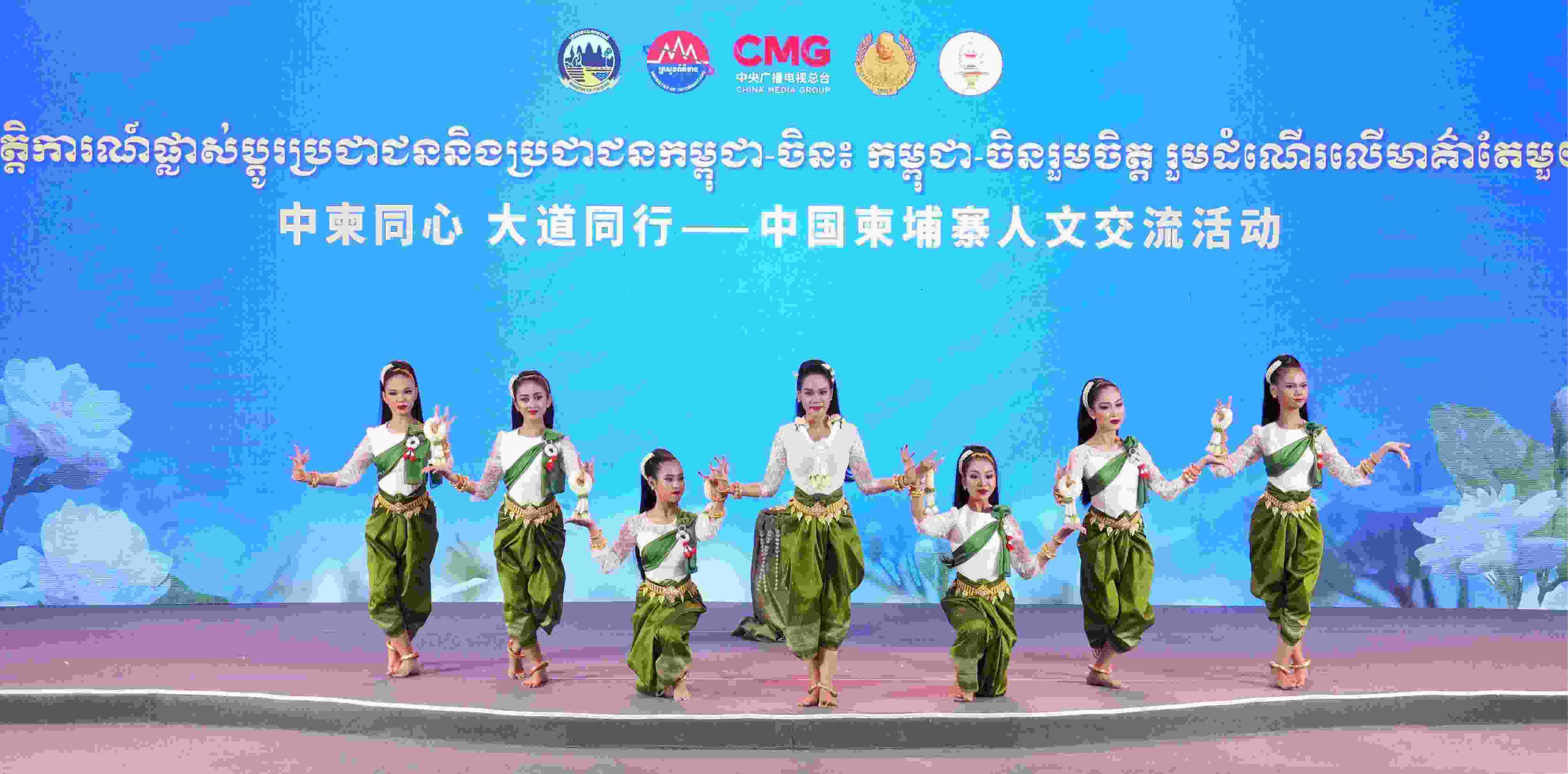 △2025年4月17日,“中柬同心 大道同行——中國柬埔寨人文交流活動”現場,來自柬埔寨帕花黛維公主舞蹈學校的師生代表在中國民歌《茉莉花》的旋律中表演柬埔寨傳統舞蹈。