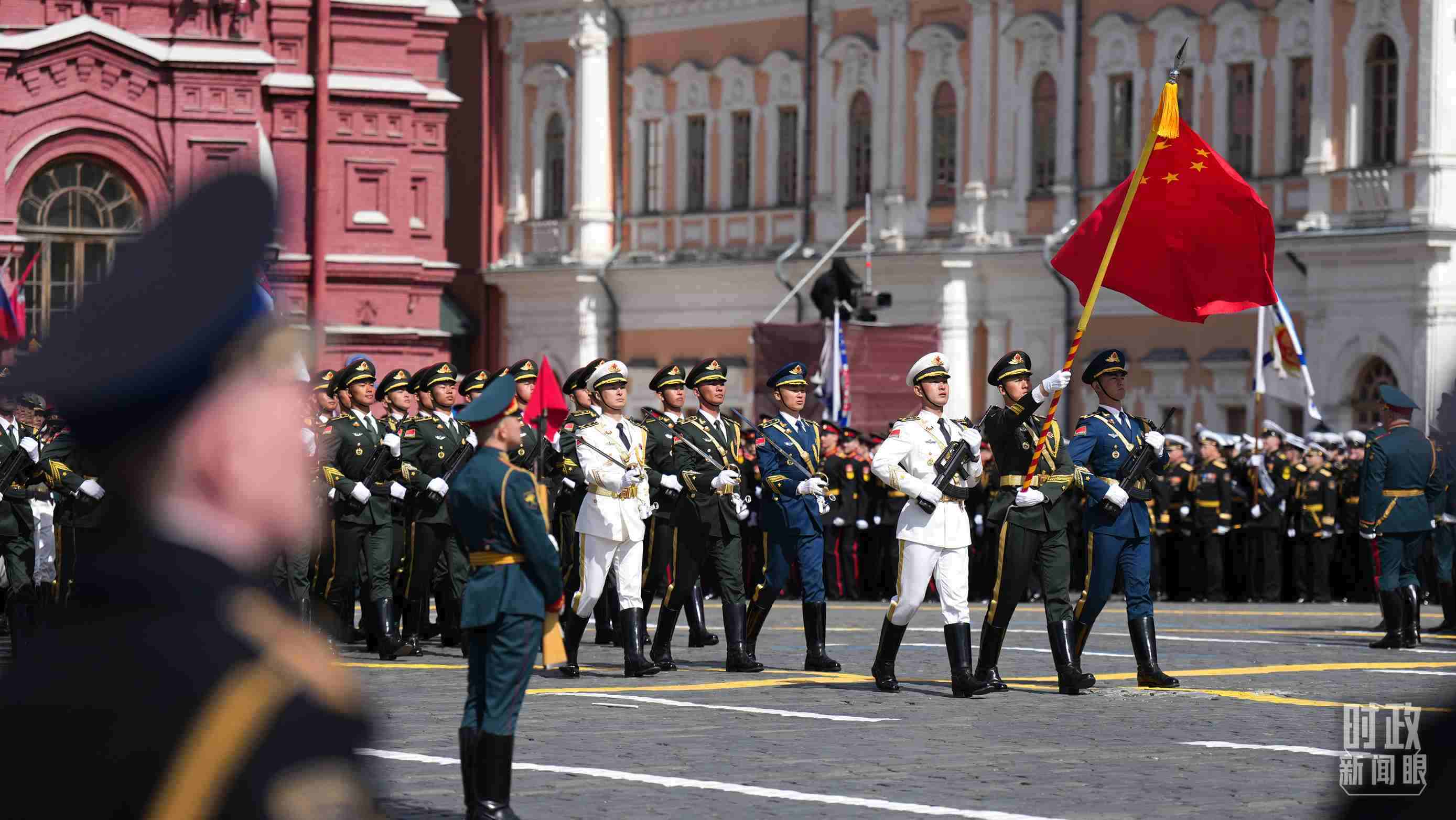 △中國人民解放軍三軍儀仗隊(duì)方隊(duì)軍容嚴(yán)整、士氣高昂,邁著堅(jiān)定有力的步伐走過紅場。(總臺記者李晉拍攝)