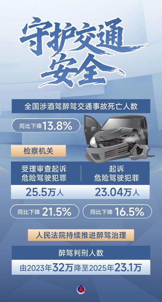 最高法報(bào)告指出,辦理醉駕刑事案件意見出臺(tái)后,判刑人數(shù)由2023年32萬降至2025年23.1萬,因酒駕造成交通事故及致死、致傷數(shù)量均有下降。同時(shí),明確“駕駛?cè)俗砭坪髥⒂幂o助駕駛功能仍應(yīng)承擔(dān)刑事責(zé)任”?! ?/p>