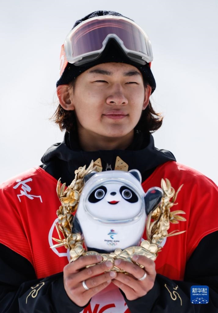 2月7日,中國選手蘇翊鳴在頒發(fā)紀(jì)念品儀式上。