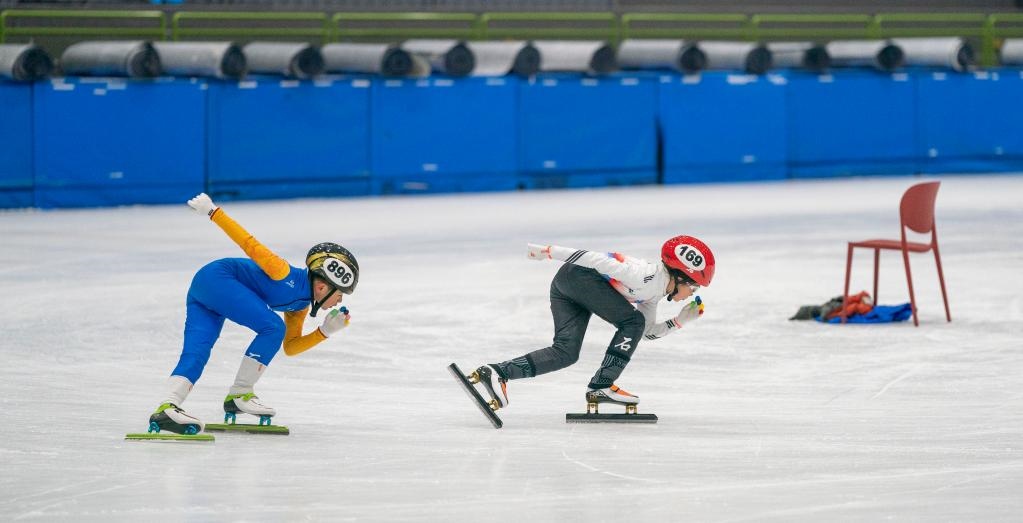 2月11日,在北京市昌平區(qū)世紀星國際冰雪體育中心,參加集訓的小隊員們進行短道速滑訓練。新華社記者才揚攝
