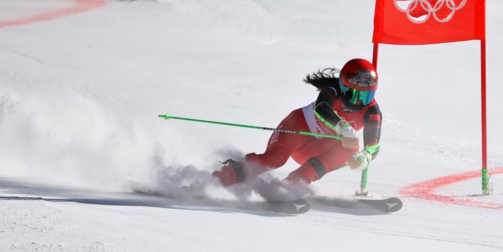 2月20日,中國隊選手孔凡影在北京冬奧會高山滑雪混合團體項目比賽中。新華社記者陳斌攝