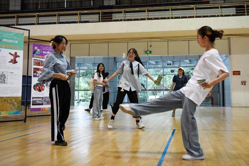 5月23日,在四川大學(xué)江安校區(qū)體育館,學(xué)生在體驗(yàn)傳統(tǒng)體育項(xiàng)目踢毽子。新華社記者胥冰潔攝