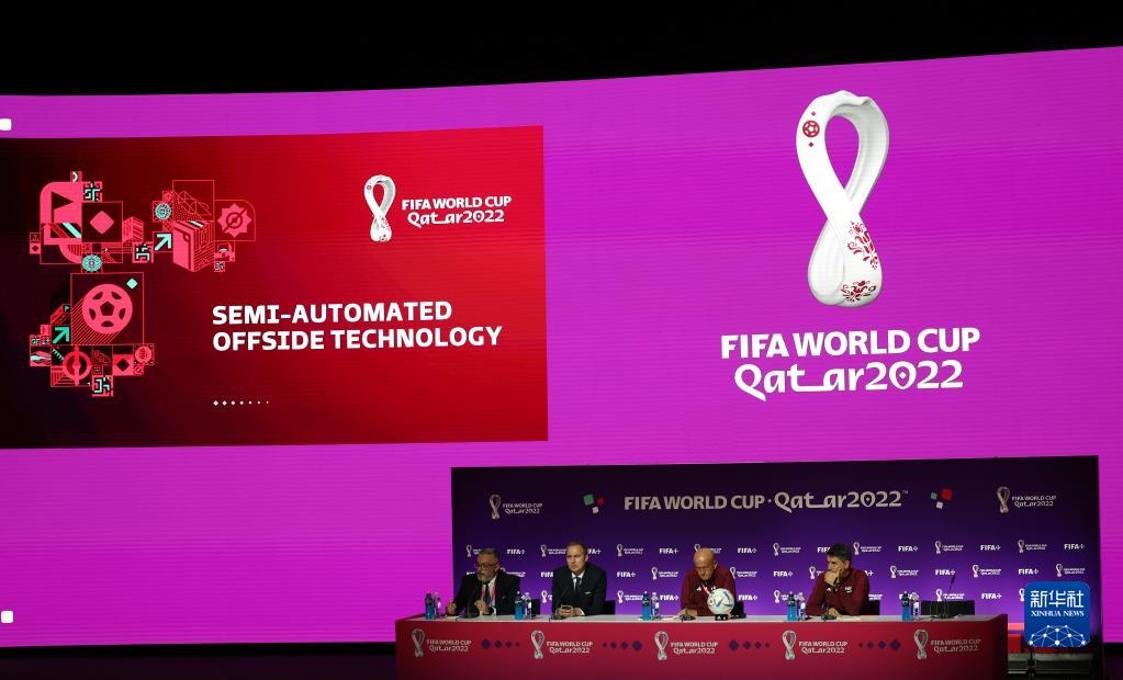 11月18日,國際足聯(lián)足球技術(shù)與創(chuàng)新總監(jiān)霍爾茲穆勒(左二)在通氣會(huì)上介紹半自動(dòng)越位識(shí)別技術(shù)。新華社記者 賈浩成 攝
