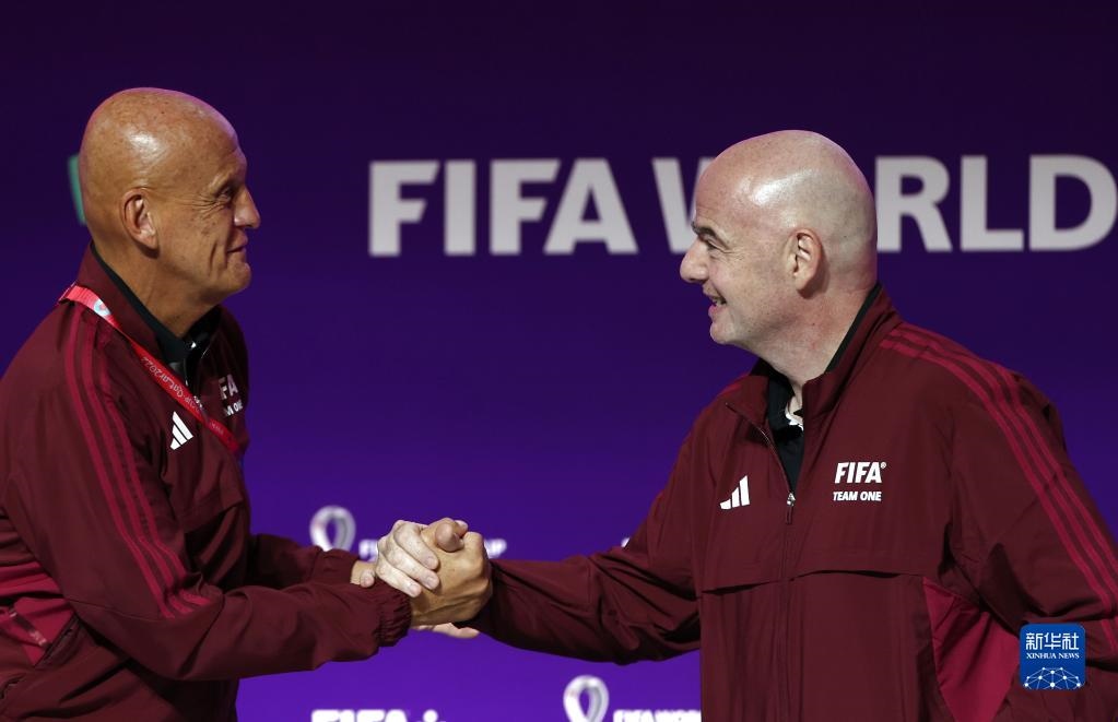 11月18日,國際足聯(lián)主席因凡蒂諾(右)與國際足聯(lián)裁判委員會(huì)主席皮耶路易吉·科利納在通氣會(huì)上握手致意。新華社記者 賈浩成 攝