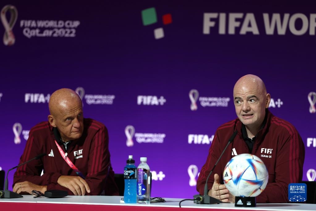 11月18日,國際足聯(lián)主席因凡蒂諾(右)與國際足聯(lián)裁判委員會(huì)主席皮耶路易吉·科利納在通氣會(huì)上。新華社記者 賈浩成 攝